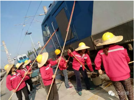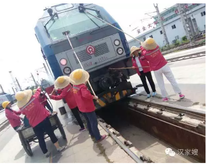 安康機(jī)務(wù)段機(jī)車保潔由漢中東方清洗家政服務(wù)有限公司負(fù)責(zé),在機(jī)務(wù)段的設(shè)備場地,股道縱橫復(fù)雜的情況下一眼就能看到,身著紅色長袖工服,頭戴被改良過得安全遮陽帽保潔員。