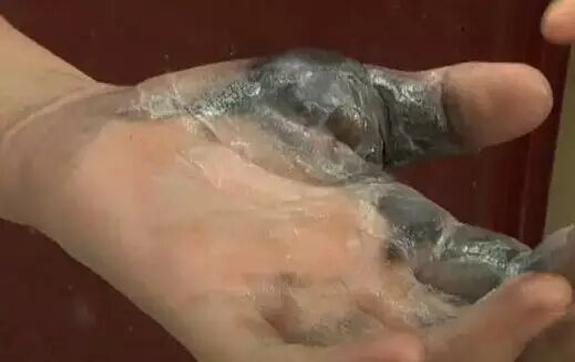 這就是小趙的左手,看上起像抹了一層黑炭,左手拇指已經(jīng)完全不能動。對于鼓起的這個黑色的腫塊兒,醫(yī)生診斷結(jié)果說:左手電弧燒傷,這一塊兒的細(xì)胞已經(jīng)壞死了。